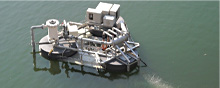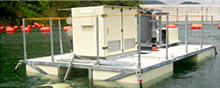 | 溶存酸素濃度の高い表層の水を噴流ポンプの駆動水として底層にジェット流を起こし、汚濁の進行を防止します。 | 水面近くのアオコを効率良く吸い込み超音波を照射して、アオコの細胞内のガス胞を破壊し、殺藻します。 | 水面上に集積したアオコを装置前端から連続的に吸引し、超音波によりアオコのガス胞を破壊させて流動循環させます。 |
